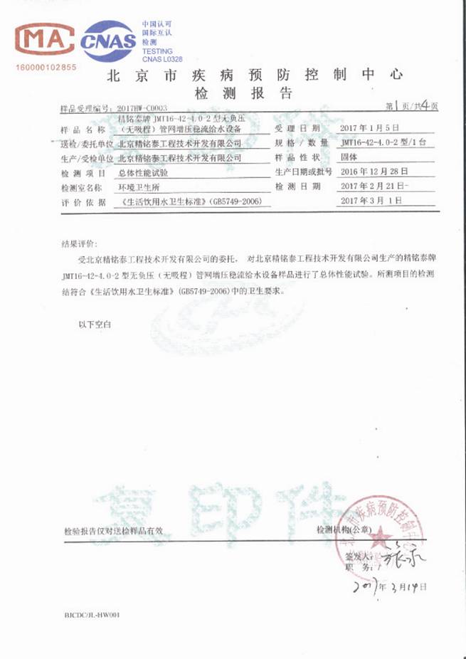 精銘泰牌JMT型無負壓(無吸程)管網增壓穩流給水設備檢測報告--衛生
