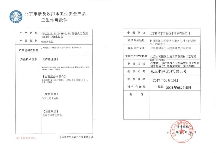精銘泰牌JZX型箱式無負壓管網疊壓給水設備衛生許可批件