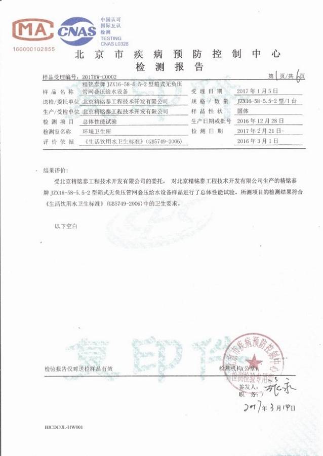 精銘泰牌JZX型箱式無負壓管網疊壓給水設備檢測報告--衛生